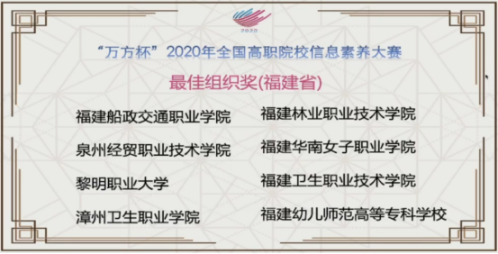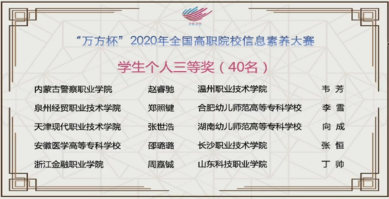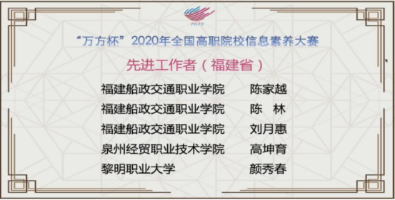 历时三个月的“万方杯”2020年全国高职院校信息素养大赛于12月6日圆满落幕,我院移联191班郑照键同学荣获全国三等奖,高坤育老师获“先进工作者”荣誉称号,图书馆荣获本届大赛最佳组织奖。