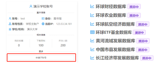校园网IP范围内,可通过图书馆点击HBN环球财经系列数据库快速访问链接直接登录或直接访问HBN数据库平台http://data.harborn.cn,登录学校账号后,通过首页的"申请子账号"按钮进行注册。注册成功后自动拥有学校账户漫游数据。使用子账号进行登录,登录后即可看到漫游数据权限。
