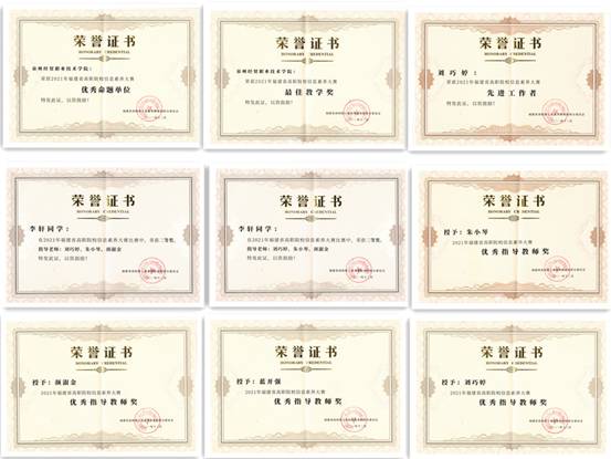 本次会议对2021年福建省高职院校信息素养大赛优秀个人及单位进行了表彰,我馆在本次大赛中斩获多个奖项。陈英鸿、李轩同学在近万名的选手中脱颖而出荣获二等奖,刘巧婷、朱小琴、蓝开强、颜淑金四位老师获优秀指导老师奖,刘巧婷老师获先进工作者,我馆获优秀命题单位和最佳教学奖。